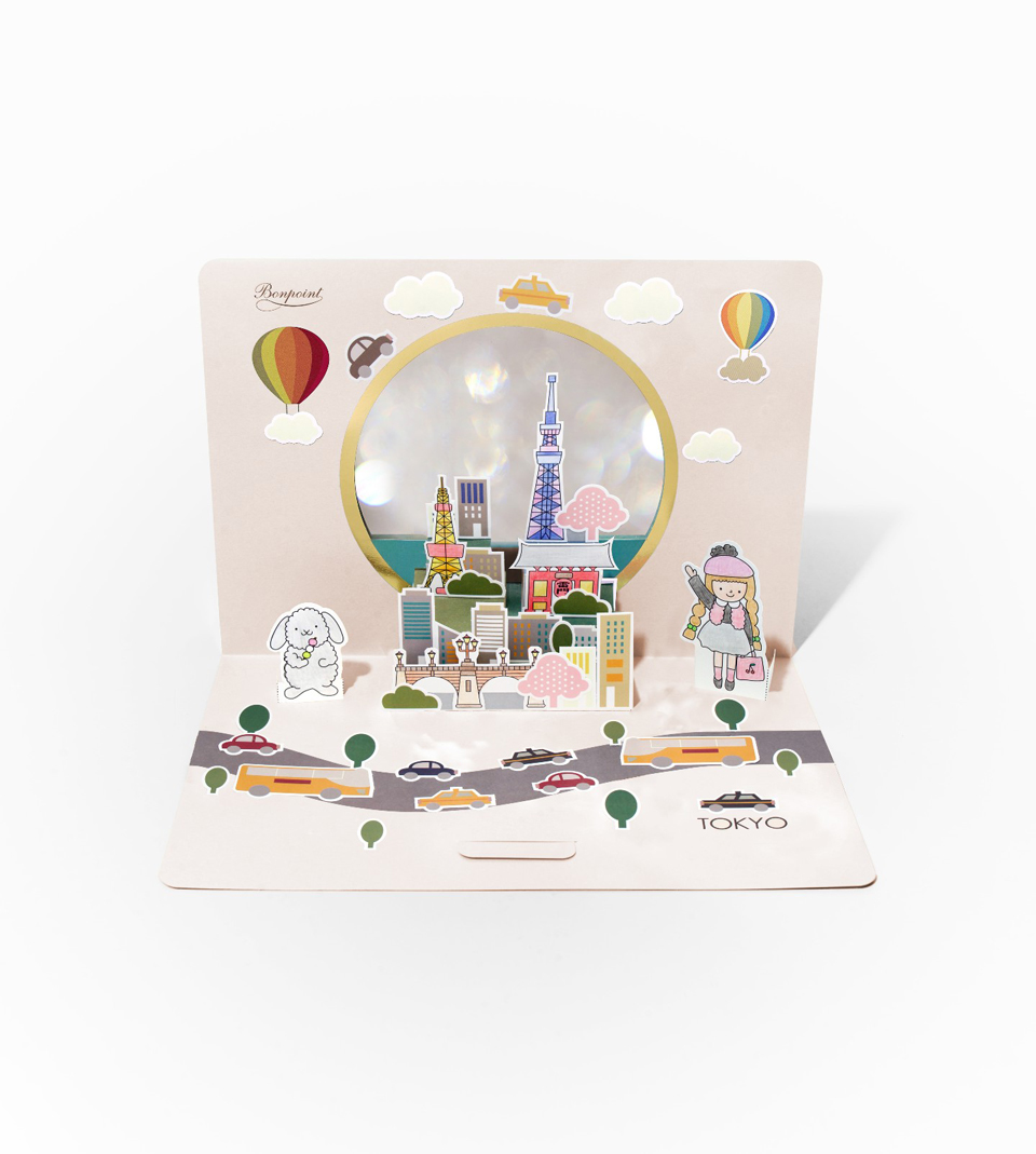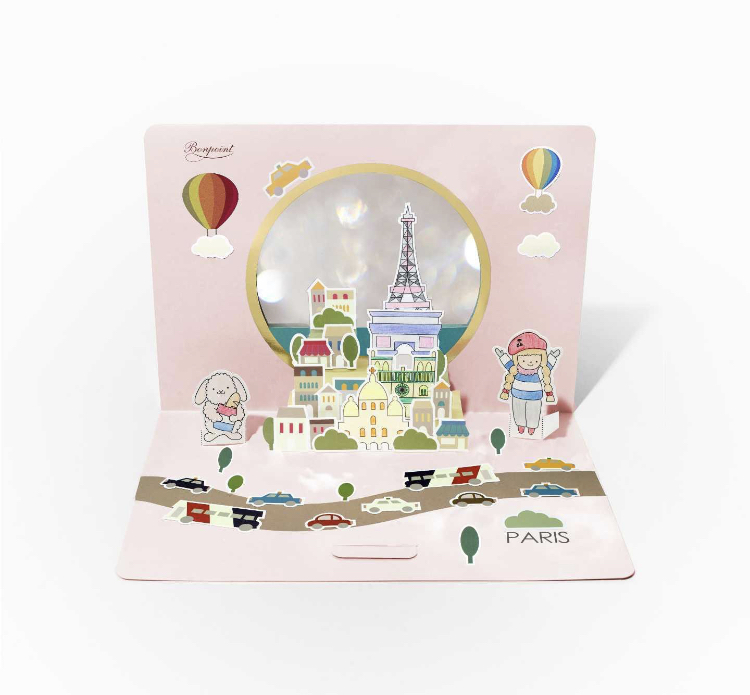 ボンポワンのキャラクター、チェリーちゃんの世界旅行をテーマにした折りたためる紙製のキラキラスノードーム。