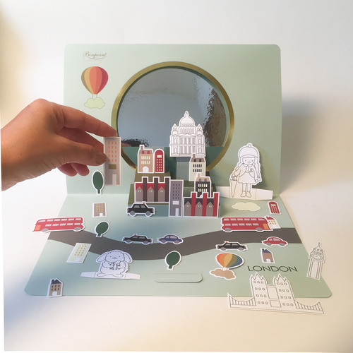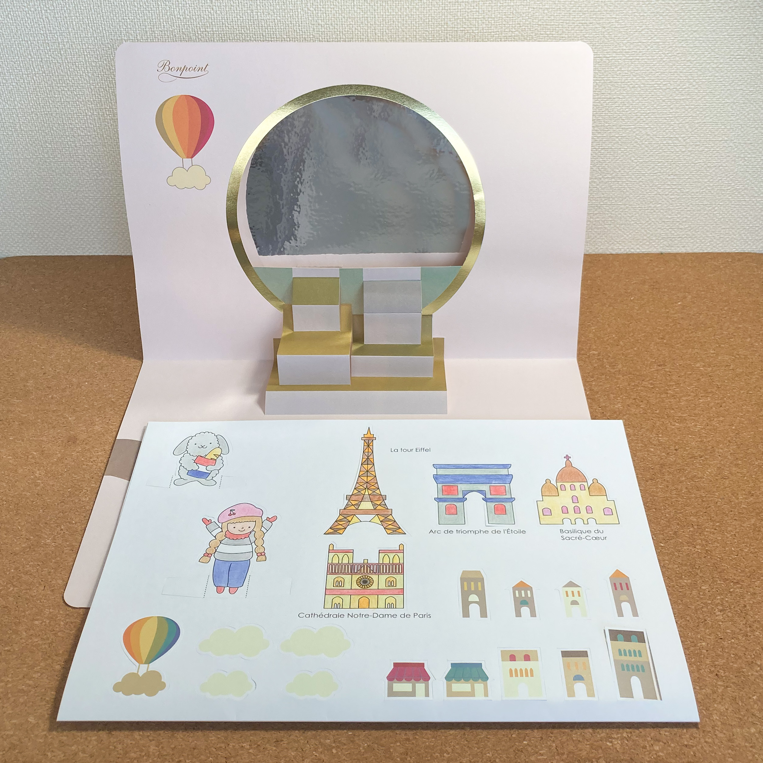 パリ編・東京編・ニューヨーク編・ロンドン編の4種類があり、各街のランドマークや乗り物・チェリーちゃんに色を塗り、好きな場所に貼って仕上げます。ペーパークラフトデザイン・イラストを制作しました。